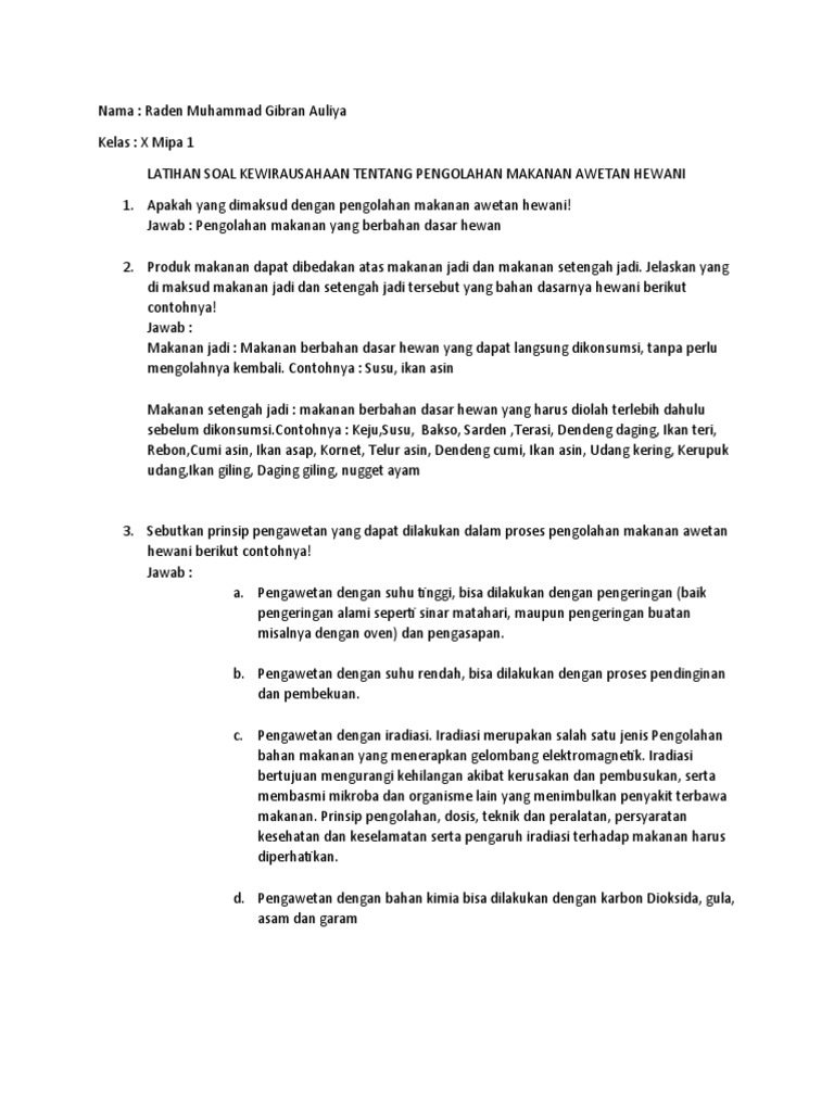 Soal dan jawaban kewirausahaan pengolahan makanan awetan dari bahan hewani.